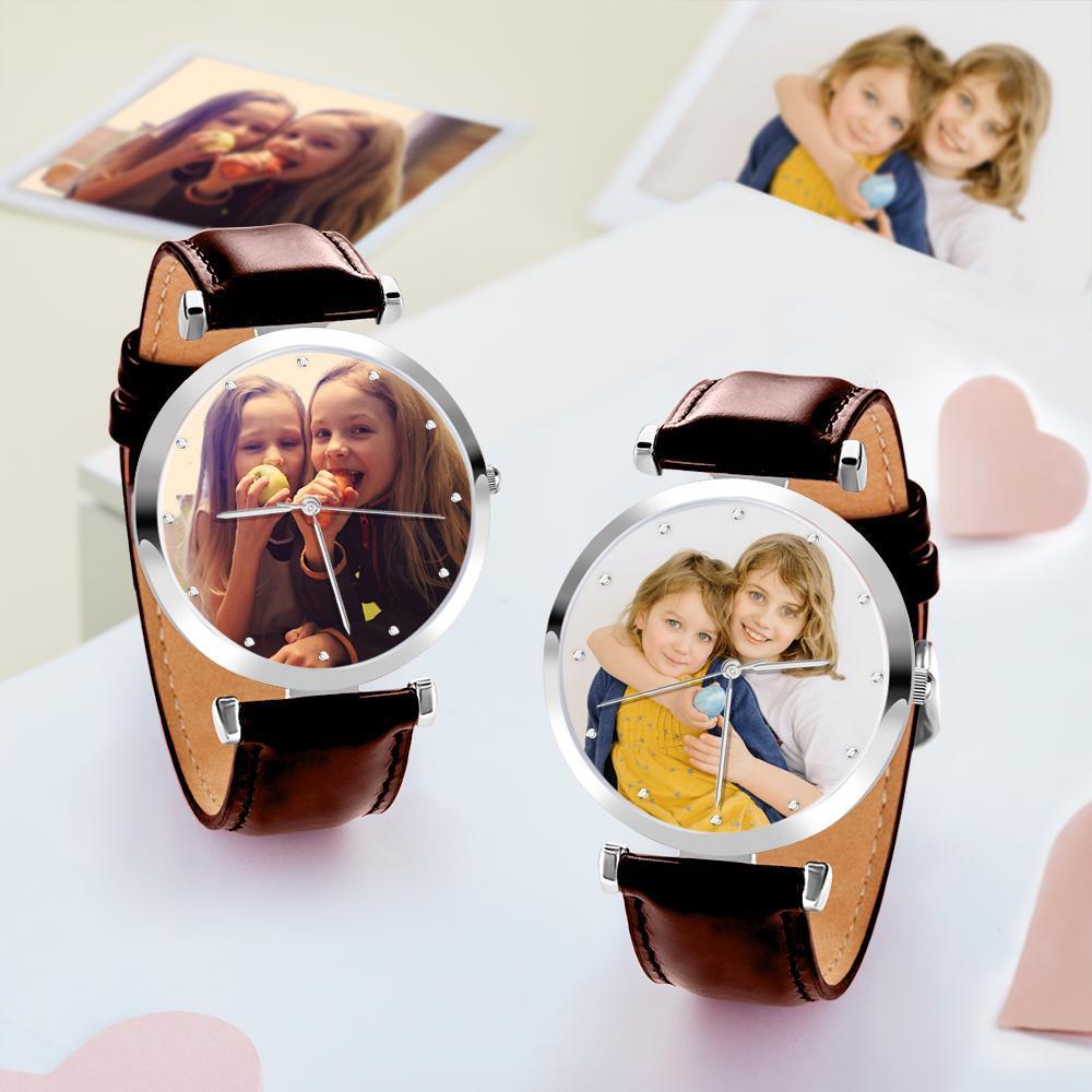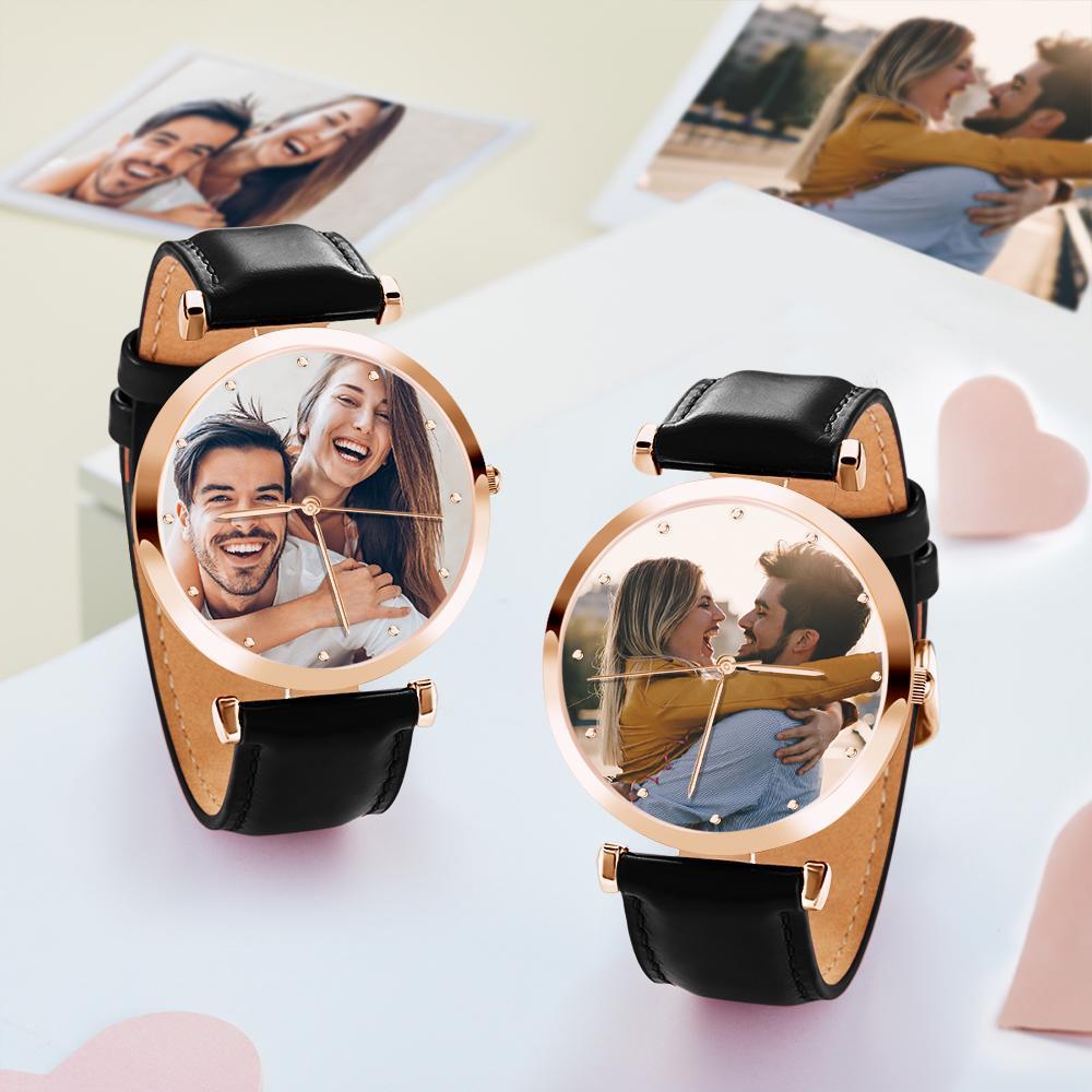 44% OFFRelógio Gravável com Foto Preto com Pulseira de Couro Castanho para Presentes Memorial Masculino -