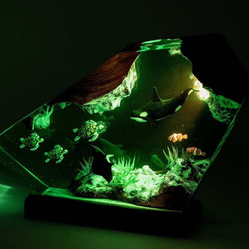 Mergulhe no mundo subaquático com nossa deslumbrante lâmpada epóxi para baleias assassinas e tartarugas marinhas. Feita artesanalmente com madeira e resina, esta luz noturna exclusiva possui iluminação LED multicolorida. Inclui: