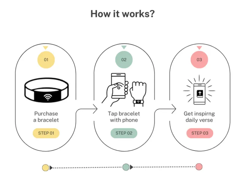 Tecnologia NFC: Cada pulseira possui um chip NFC integrado que pode ser acessado no seu telefone. Com apenas um toque em seu smartphone, você pode acessar escrituras e outros recursos edificantes.