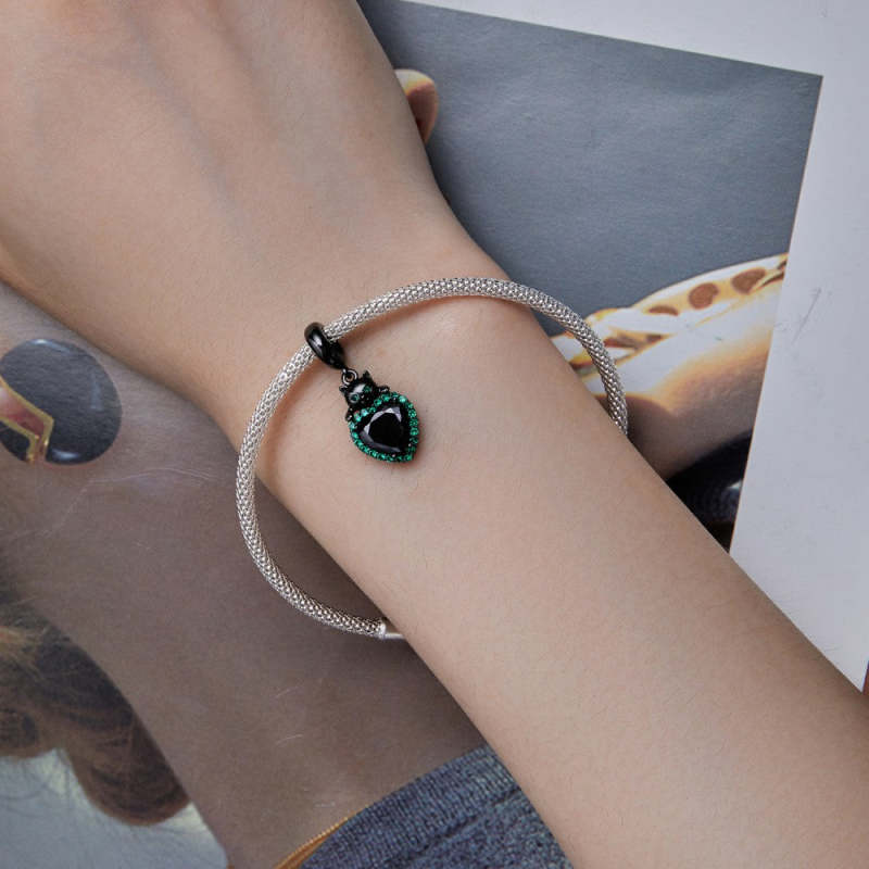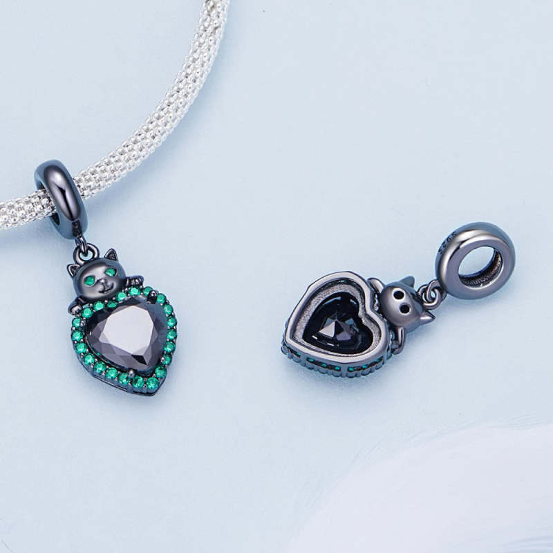 Pendente Gato Preto com Coração Verde Prateado