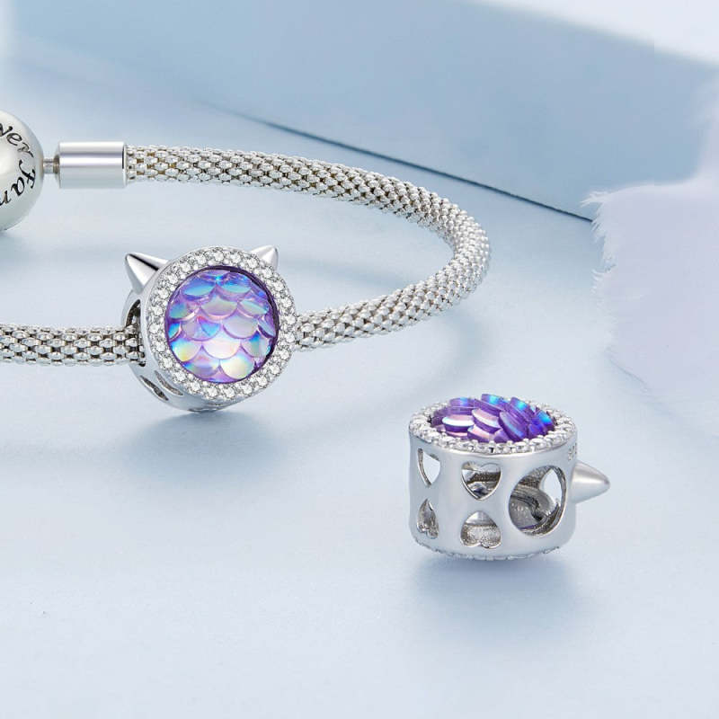 Charme Cabeça de Gato Escamas de Peixe Roxo Gradiente Prateado