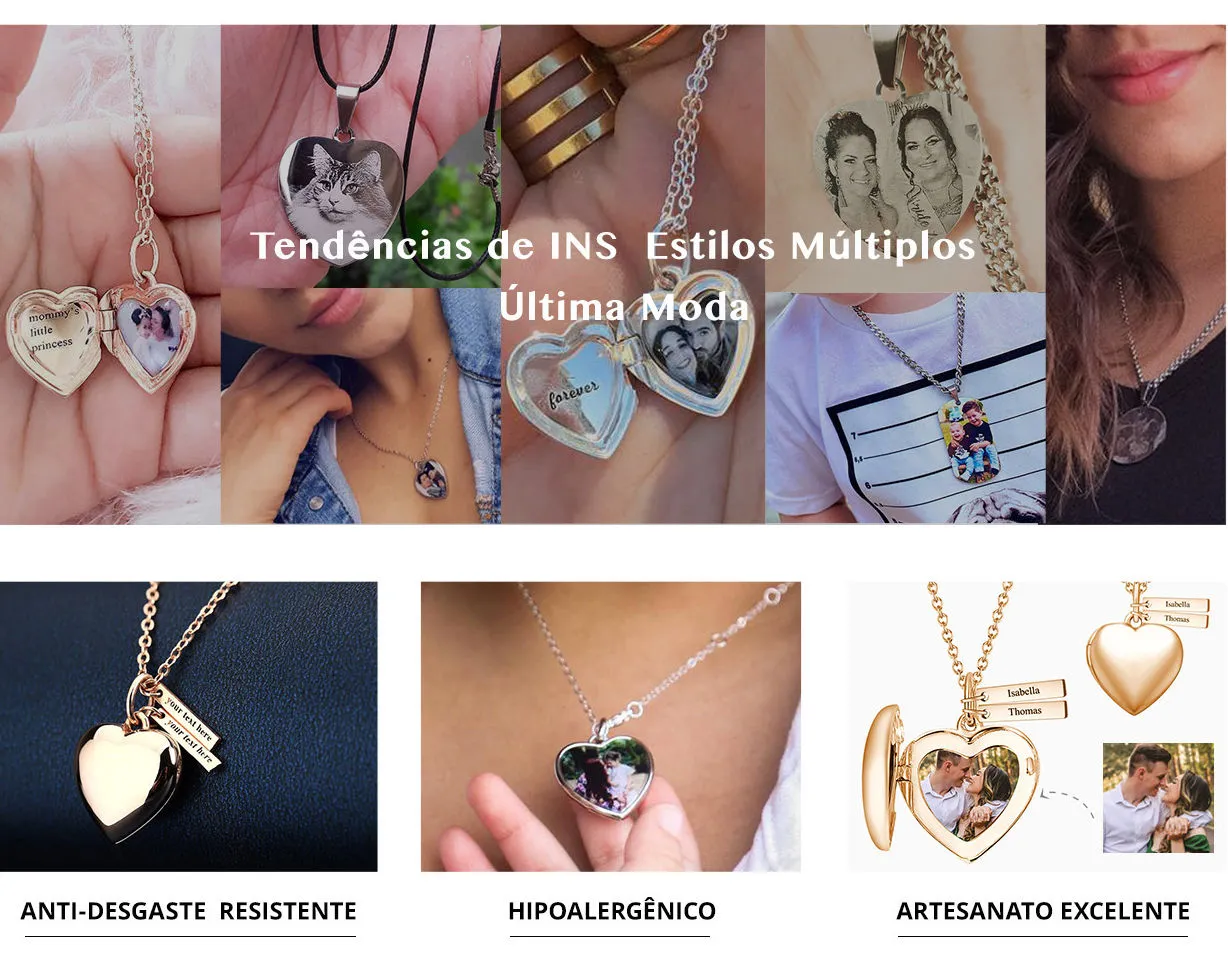 Impressão Cruzada Colar com Medalhão de Coração de Foto com Gravação Banhado a Ouro 14k