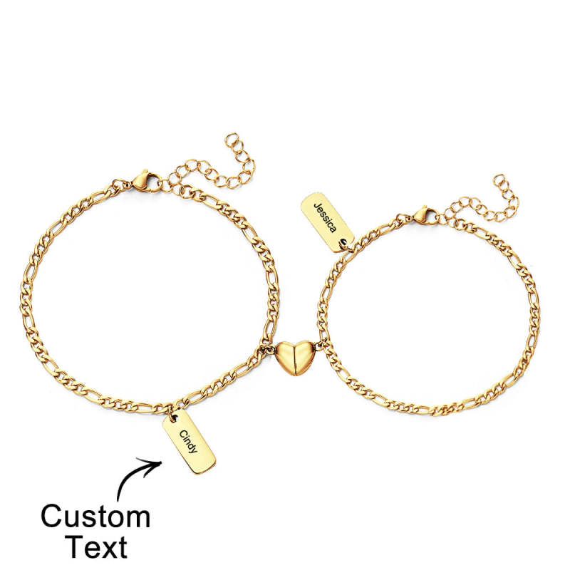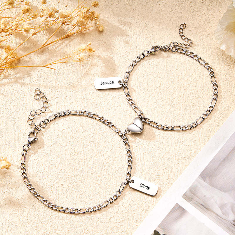Pulseira Gravada Personalizada Com Coração Magnético Presente De Casal Com Corrente Simples