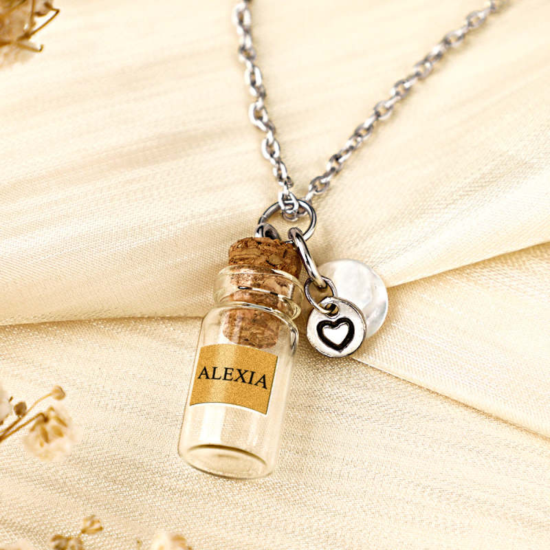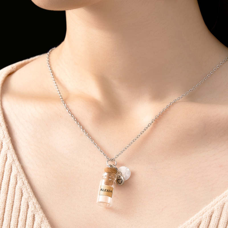 Este é um pingente de colar especial. Frascos de vidro transparente que permitem armazenar pertences de entes queridos falecidos, cabelos/dentes/pêlos de animais de estimação/botões e muito mais, com letras personalizadas. Mantenha seus entes queridos ao seu lado o tempo todo.