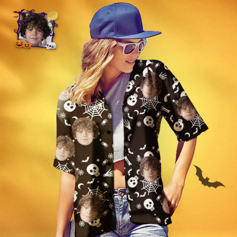 Coloque sua foto na camisa havaiana personalizada de Halloween que os pais e filhos usam.