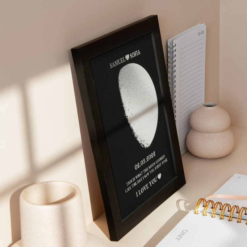 Aprenda as fases lunares e os nomes personalizados com nossa moldura de madeira personalizada para nomes e fases da lua. Insira uma data de nascimento para vivenciar o ciclo da lua e descobrir como é viver na lua. Com oito fases distintas e texto personalizável, esta moldura é uma adição educativa e única à coleção de qualquer entusiasta do espaço.