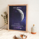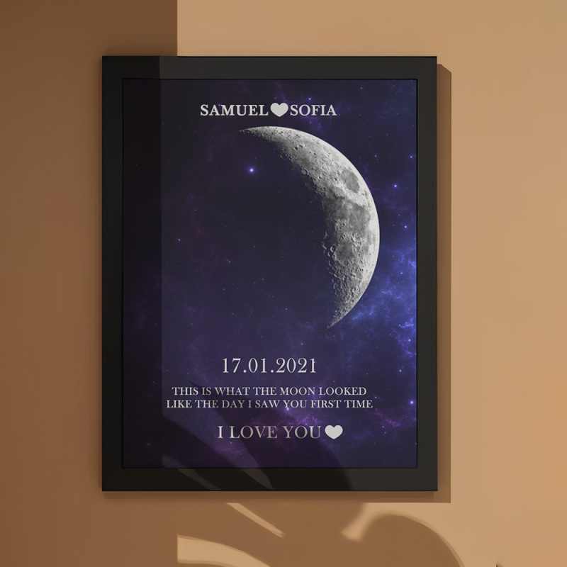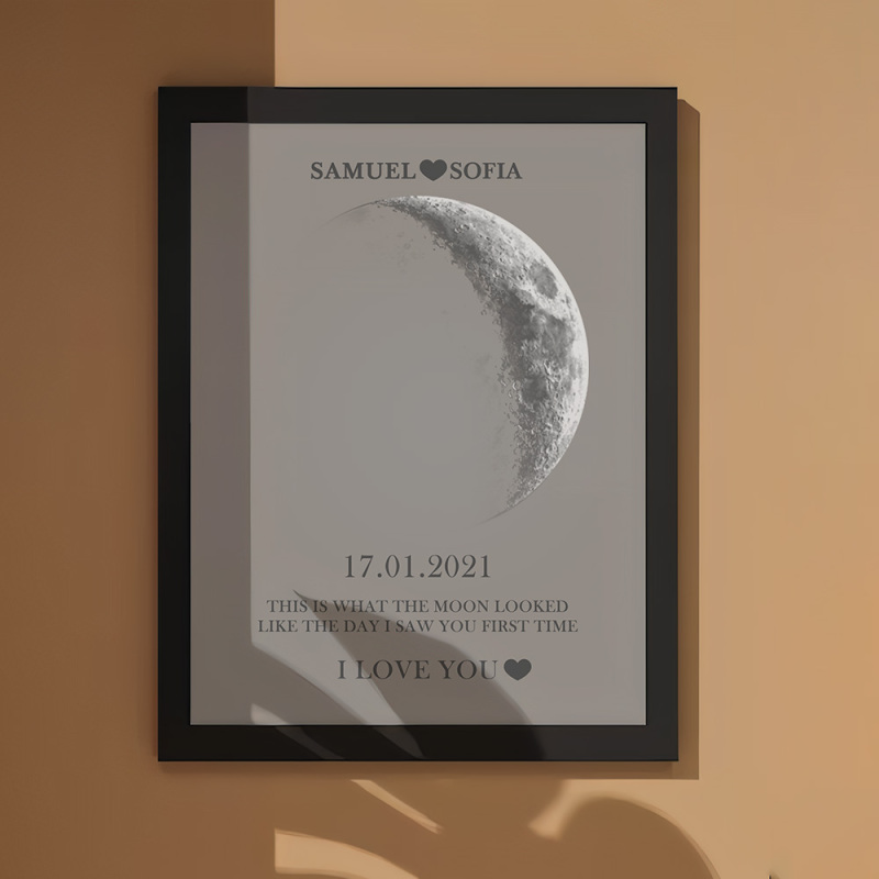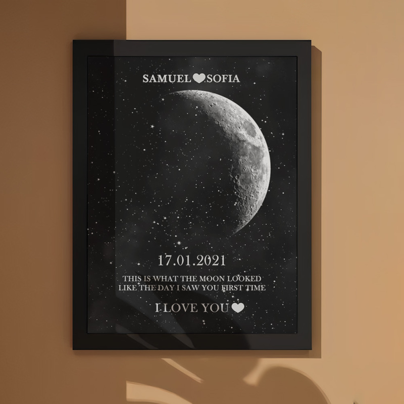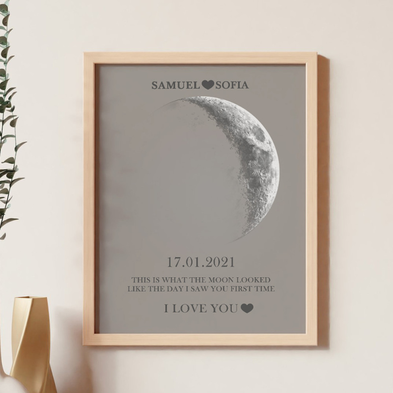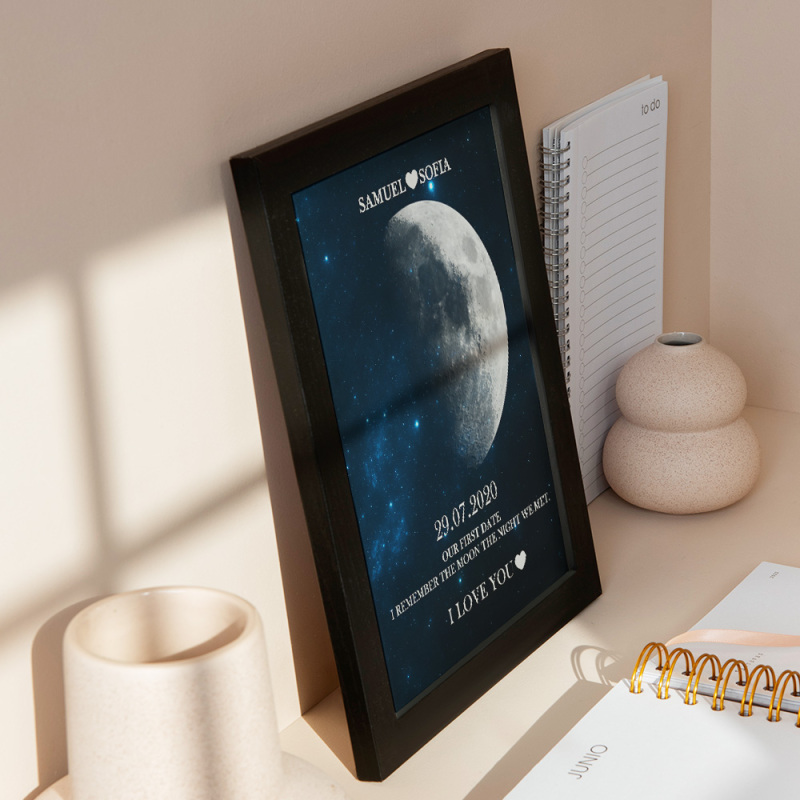 Em cada momento extraordinário, usamos as fases eternas da lua para comemorar esses momentos emocionantes. Comemore o seu amor com um presente atencioso e personalizado, criando lembranças únicas e queridas para aquela noite especial. Nossa moldura de madeira com impressão noturna da lua exibe a fase lunar precisa desde a noite em que você se conheceu ou no dia em que nasceu, tornando-a um presente verdadeiramente excepcional e emocionalmente rico.