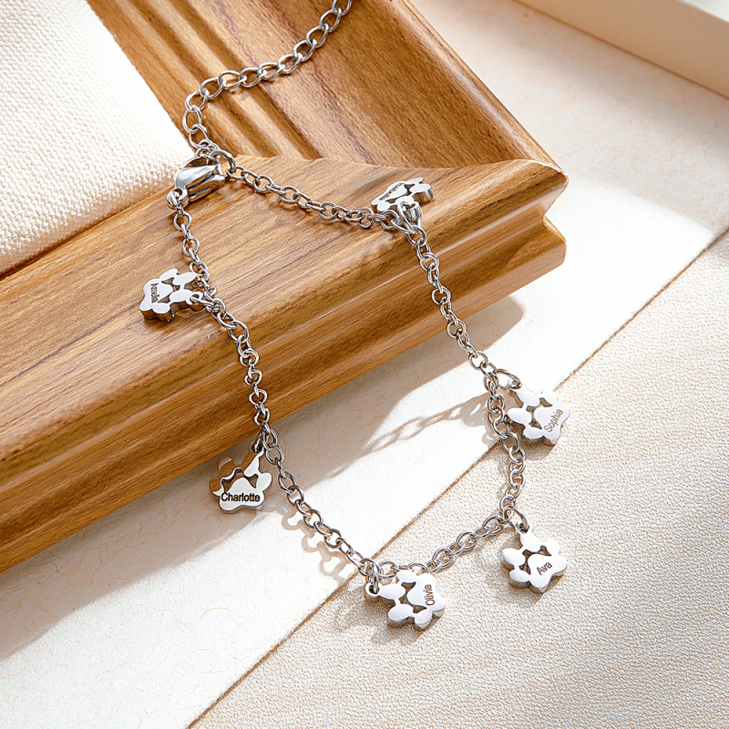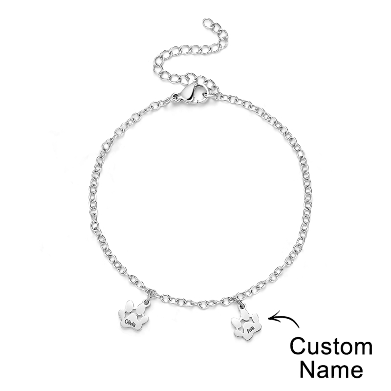 Pulseiras personalizadas minimalistas com nome e estampa de pata, o acessório perfeito para todos os amantes de animais de estimação! Estas pulseiras delicadas são adornadas com adoráveis estampas de patas que capturam a essência do seu amigo peludo. Cada pulseira pode ser personalizada com o nome do seu animal de estimação, acrescentando um toque pessoal a esta peça já requintada. Quer você seja um amante de cães e gatos, nossas pulseiras minimalistas para patas foram projetadas para mostrar seu amor por animais de estimação de uma forma minimalista e elegante. Feitas à mão com amor e atenção aos detalhes, estas pulseiras são o presente ideal para você ou para outro entusiasta de animais de estimação. Use o nome do seu animal de estimação com orgulho e mantenha-o perto do seu coração com nossas pulseiras personalizadas com nome de animal de estimação. Compre agora e abrace o vínculo entre você e seu companheiro peludo!.
