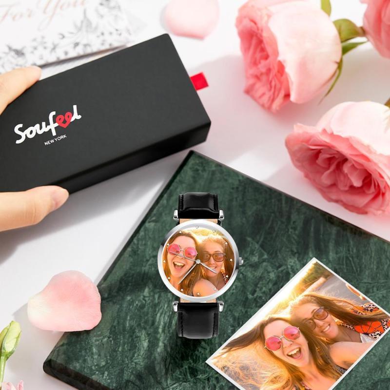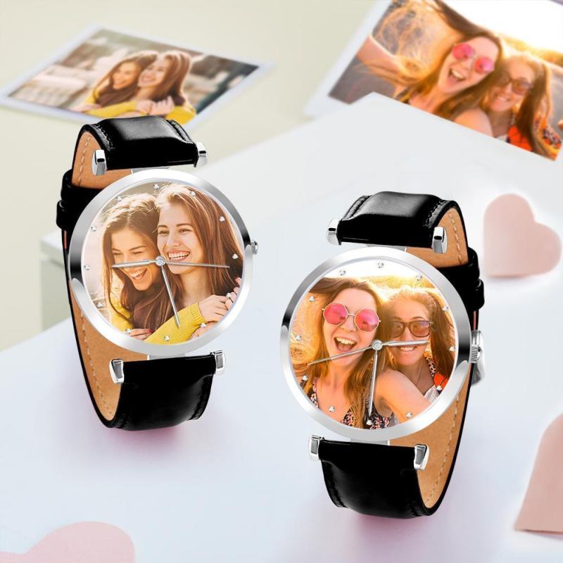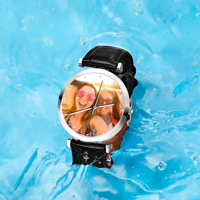 Relógio Gravável com Foto Personalizado de Pulseira de Couro Preto Presentes Únicos Masculinos