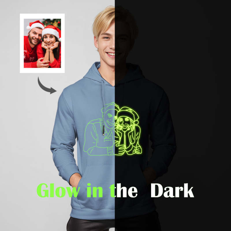 Transforme suas fotos favoritas em uma exibição hipnotizante de cores que realmente se destacam no escuro. Nossa tinta avançada que brilha no escuro garante que suas memórias brilhem, criando um impacto visual impressionante. Seja um instantâneo de uma ocasião especial, um momento sincero com seus entes queridos ou uma paisagem de tirar o fôlego, este moletom com capuz transforma suas memórias em arte vestível.