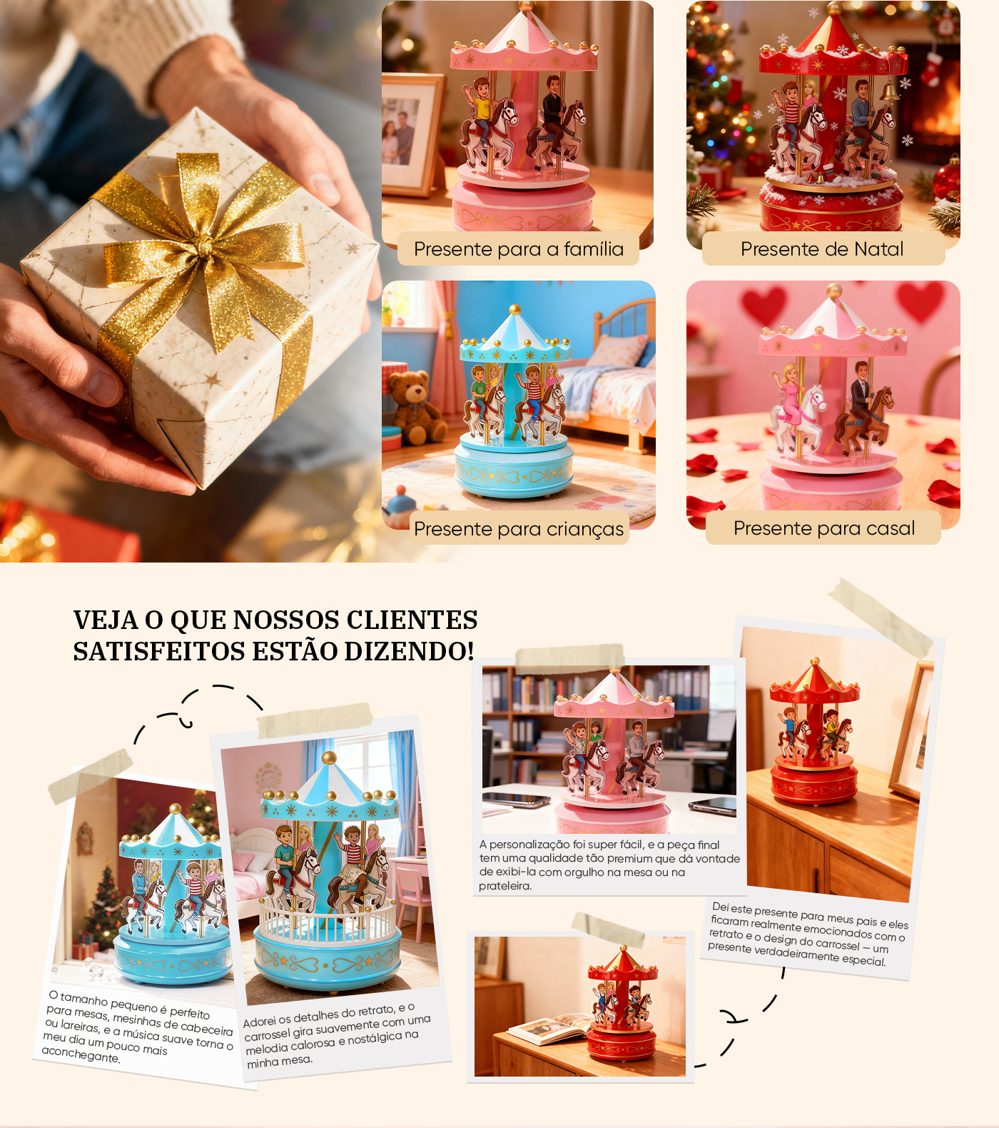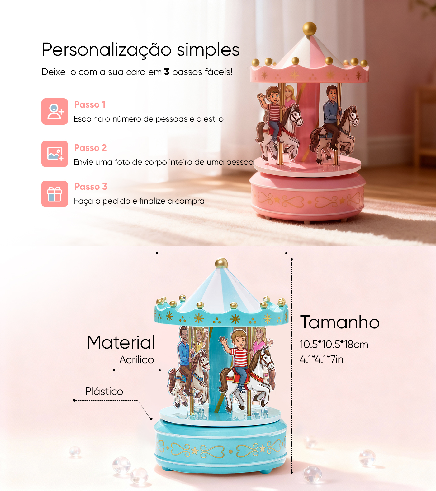 Eternize momentos preciosos com nosso enfeite de mesa personalizado em formato de carrossel musical para retratos. Esta elegante decoração transforma seus retratos de família em um encantador carrossel giratório que toca uma melodia suave. Perfeito para mesas, prateleiras ou mesas de cabeceira, adiciona um toque pessoal a qualquer espaço e serve como um presente emocionante para entes queridos.