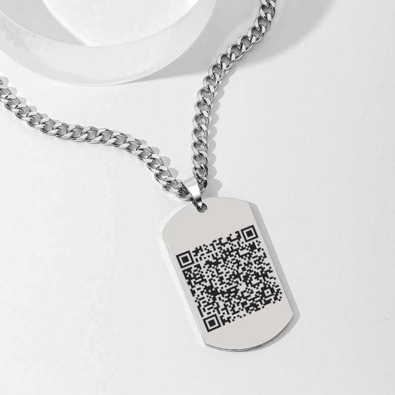 A etiqueta de identificação personalizada é feita de aço inoxidável, resistente à corrosão e resistente a altas temperaturas; é feito de aço inoxidável e chapeamento de íons, impermeável e altamente polido. Este colar pode ser personalizado com fotos e códigos QR. Digite qualquer texto, vamos ajudá-lo a fazer um código QR e colocá-lo no colar. Você pode dar de presente para pessoas importantes.