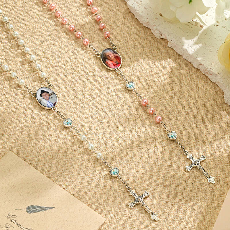 Colar De Contas De Rosário Personalizado, Colar De Cruz De Pérolas De Imitação De Vidro Personalizado Com Foto