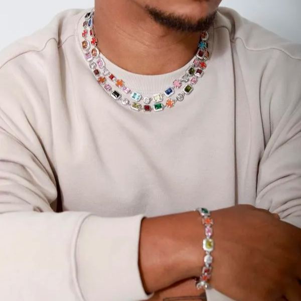 Eleve seu estilo de verão com nossa deslumbrante coleção de joias Summer Dopamine - com um colar de diamantes brilhantes e uma pulseira geométrica vibrante! O colar de estrelas brilha com diamantes delicados, adicionando um toque de elegância a qualquer look, enquanto a pulseira ajustável de pedras preciosas coloridas combinando traz um charme lúdico com suas pedras preciosas ousadas e atraentes e design flexível (perfeito para todos os tamanhos de pulso).