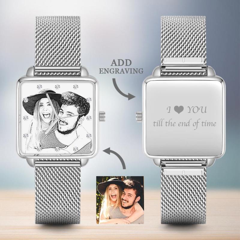 Relógio Gravável com Foto - Prata Caixa Quadrada Relógio de Esboço para Namorado/Pai