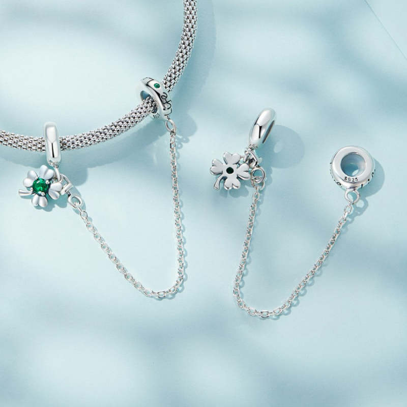 Corrente de charme de segurança trevo de quatro folhas prateada