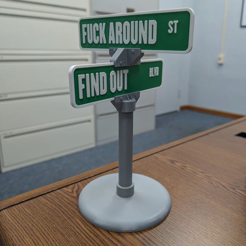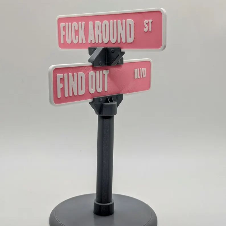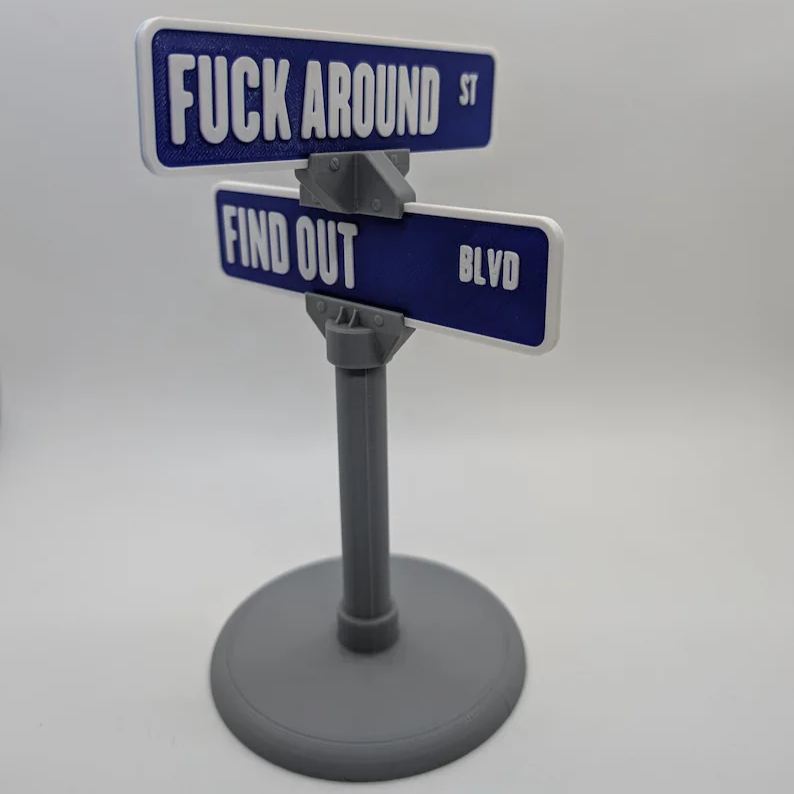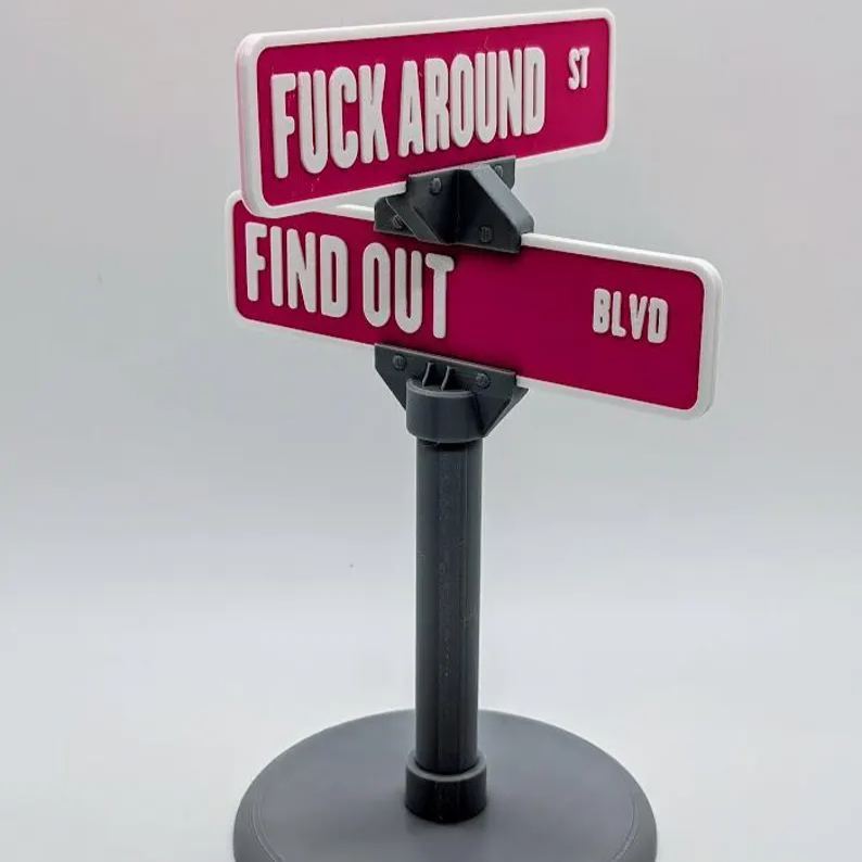 Exiba seu estilo e mostre à estrada o que você é. Pegue seu “FUCK AROUND ST & FIND OUT BLVD” Enfeite de carro hoje!