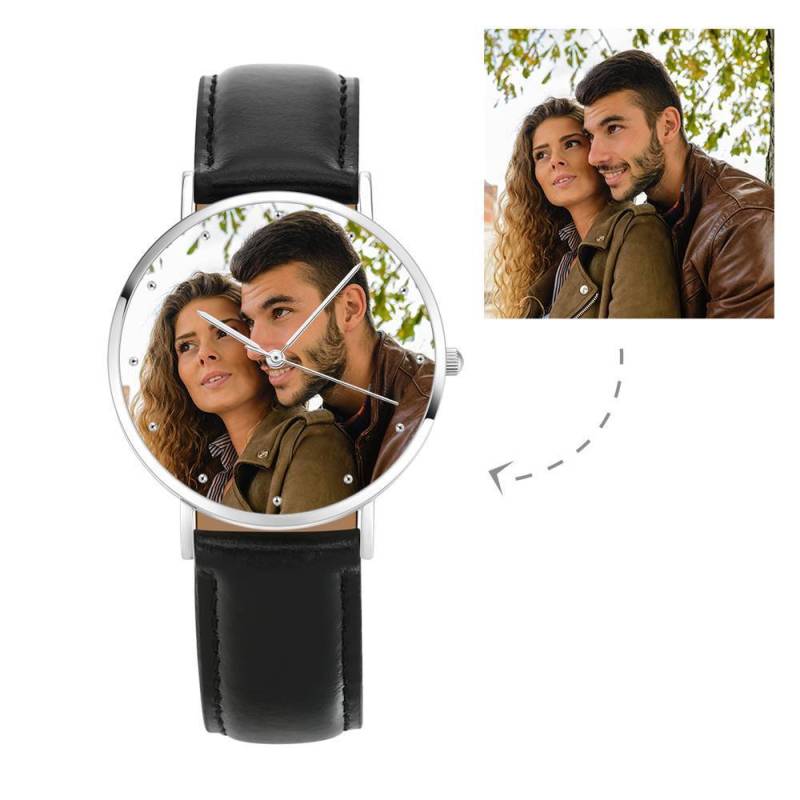 Presentes do Dia das Mães - Unissex Relógio Gravável com Foto com Pulseira de Couro Preto 40mm