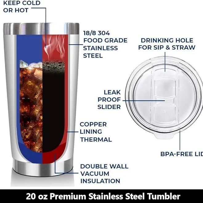 ISOLAMENTO DE VÁCUO DE PAREDE DUPLA -; Usamos isolamento de parede dupla para ajudar a reter temperaturas de líquidos quentes e frios, o que torna nosso copo também ótimo para água, café, cola, cerveja, suco, chá, sorvete, coquetéis e muito mais.
