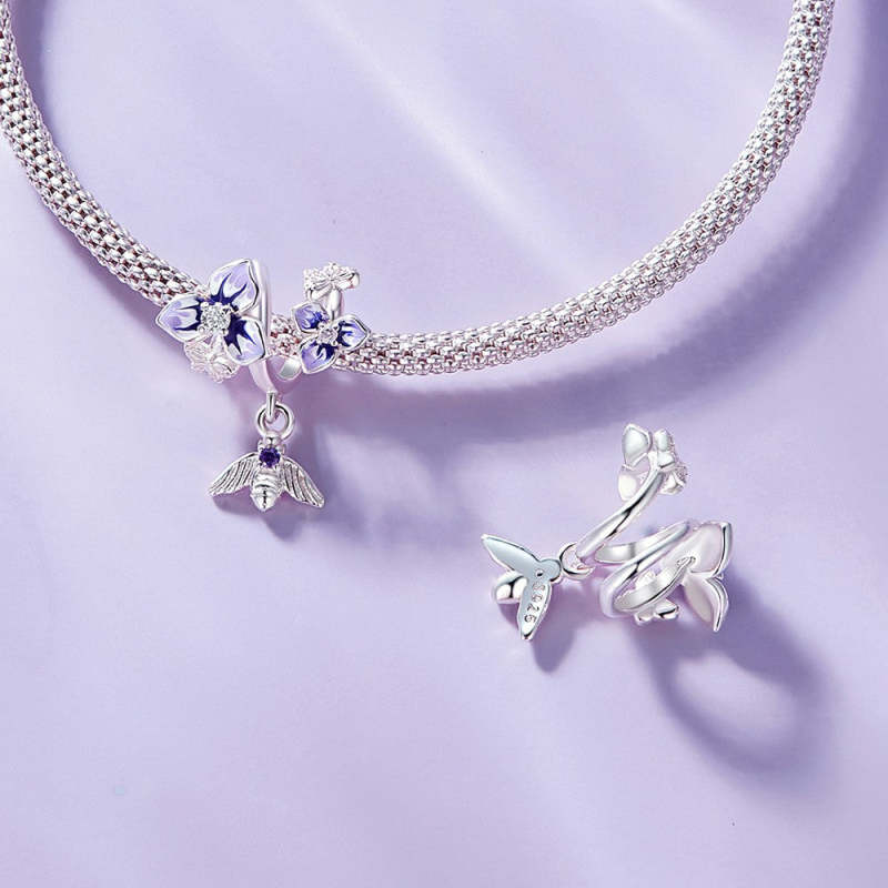 Pensies and Bees Dangle Charm Prata