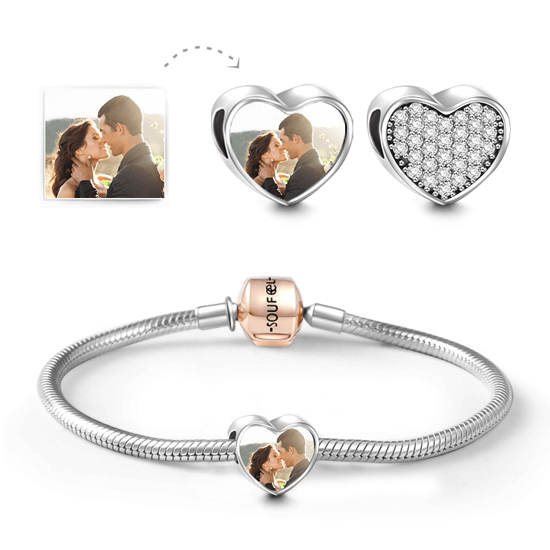 Pulseira Personalizada Soufeel Serpente Cadeia Pulseira com Berloque com Foto de Coração Pavimentado a Zirção Prata Banhado a Ouro Rosa