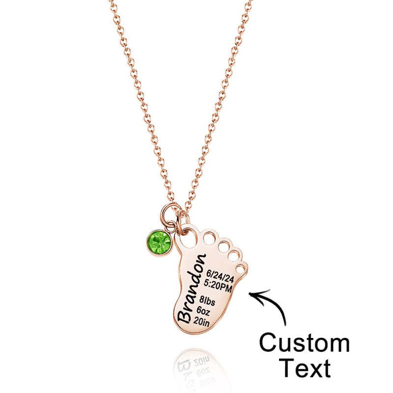 Celebre a alegria da maternidade com nosso colar personalizado para pés de bebê. Este charmoso colar com pingente apresenta uma pedra de nascimento exclusiva e pode ser personalizado com o nome do seu bebê. Um chá de bebê ou presente de aniversário perfeito para novas mamães, adicionando um toque pessoal a qualquer roupa.