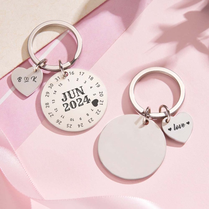 Esses chaveiros de calendário são uma ótima maneira de lembrar a data especial de um aniversário, casamento ou até mesmo um primeiro encontro ou beijo. Eles podem ser personalizados em ambos os lados. Um lado pode ser gravado com o mês que você escolher com seu dia especial marcado. O outro lado pode ser gravado com imagens.