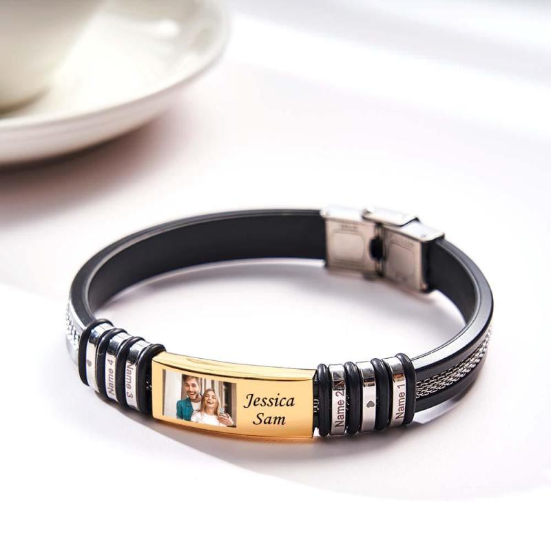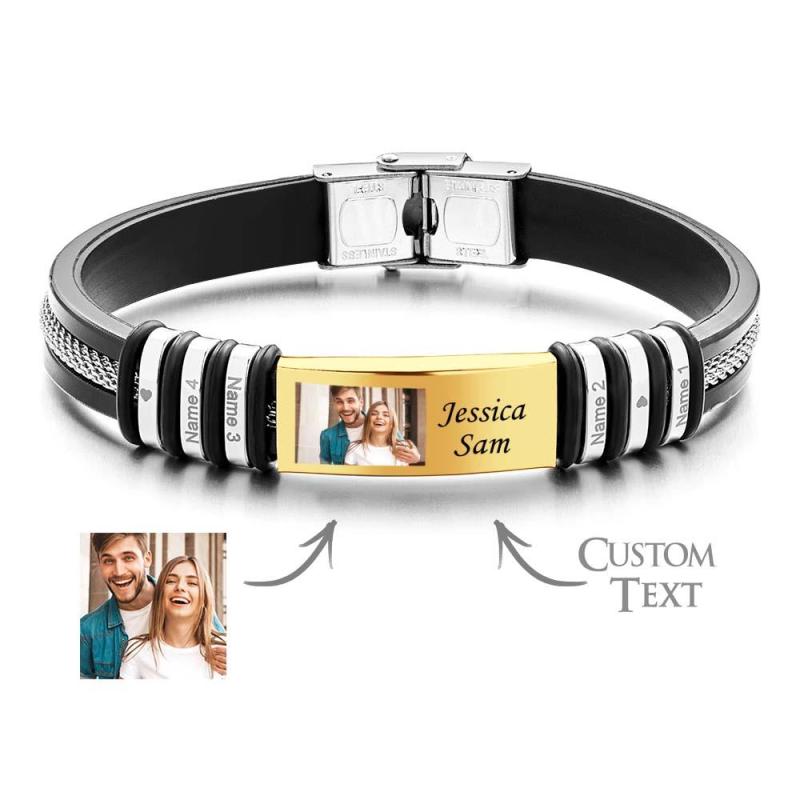 Feitas com precisão e valor sentimental, nossas pulseiras de memória com fotos coloridas personalizadas são o epítome de gestos sinceros. Expresse seu carinho e crie memórias duradouras com esta pulseira personalizada gravada, exibindo lindamente quatro nomes de sua escolha. Disponível em uma variedade de cores cativantes – prata, ouro e preto – esta pulseira masculina funciona como um presente atemporal de aniversário ou de amizade. Valorize esses momentos especiais e deixe esta pulseira servir como um lembrete constante desses laços queridos.
