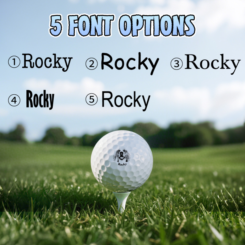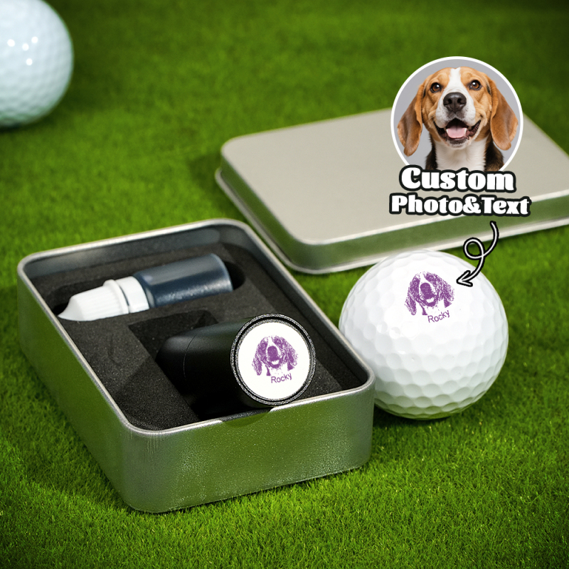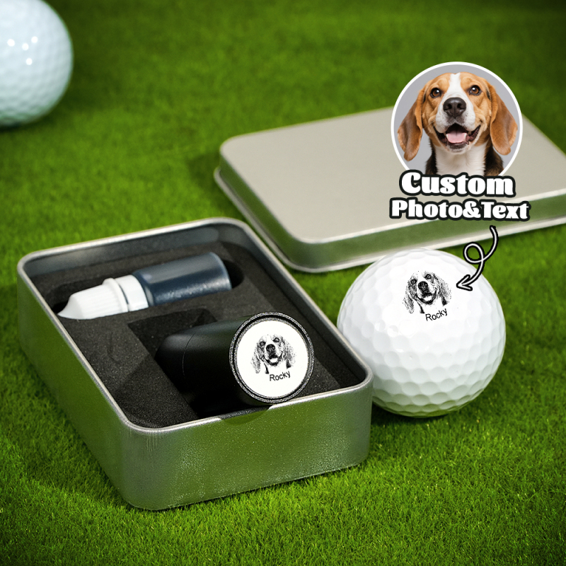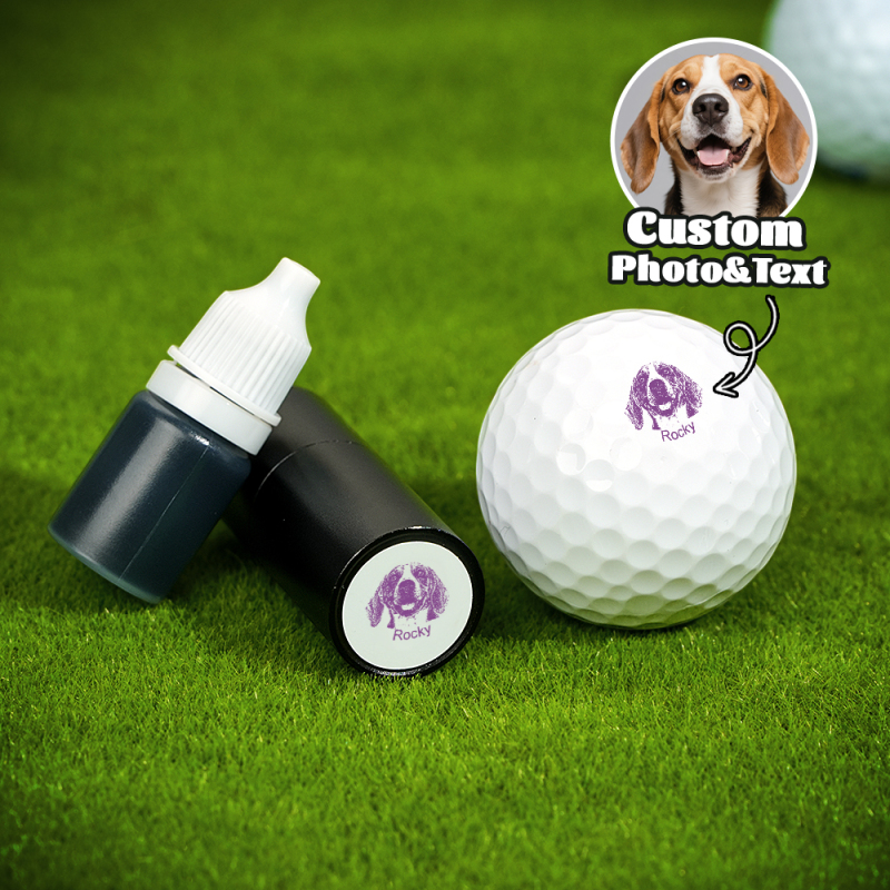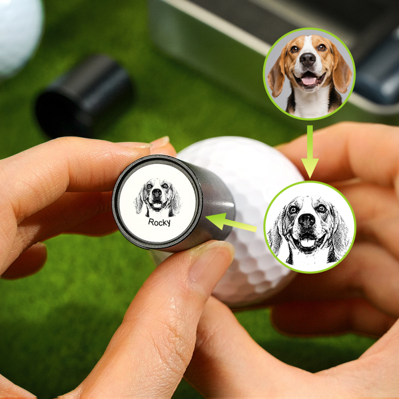 Este exclusivo carimbo autoentintado de bola de golfe apresenta um retrato personalizado do seu cão ou gato, juntamente com o nome ou uma data especial - perfeito para marcar suas bolas de golfe com estilo.