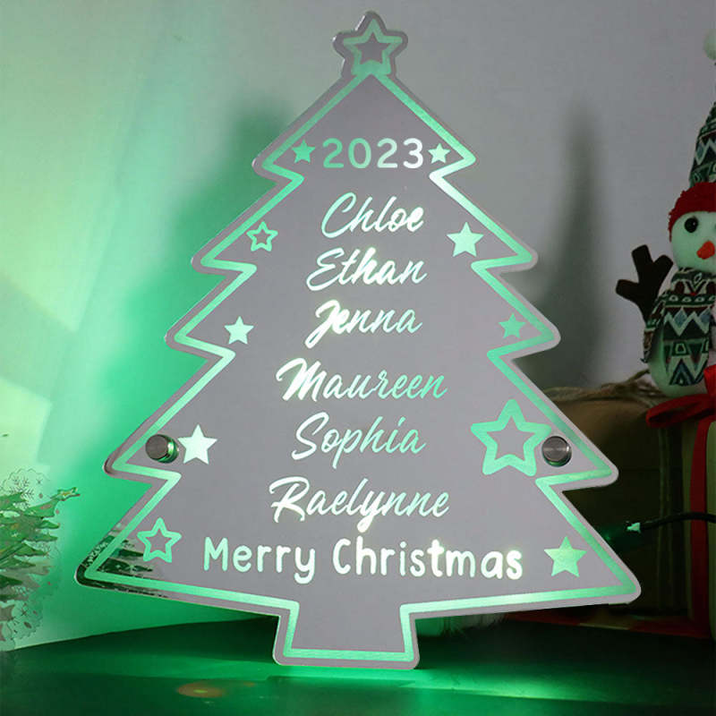 Nome da família personalizado árvore de natal espelho luz sinal de néon com luzes led texto personalizado multicolorido brilho decoração da parede
