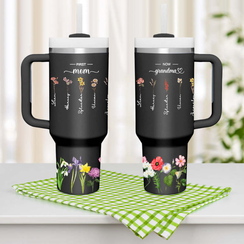 Apresentamos o copo de flores personalizado com canudo para mamãe e vovó, um copo estiloso e significativo para as mulheres especiais em sua vida. Este copo personalizado permite que você personalize lindas flores com nomes, criando uma linda e prática homenagem para sua mãe e sua avó.