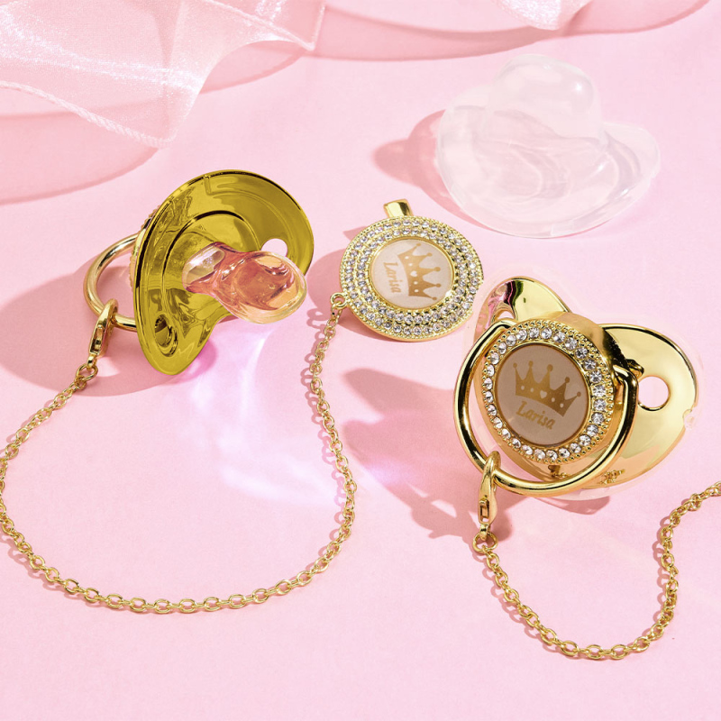Torne os itens essenciais do seu bebê seguros, elegantes e inesquecíveis com esta luxuosa chupeta personalizada!