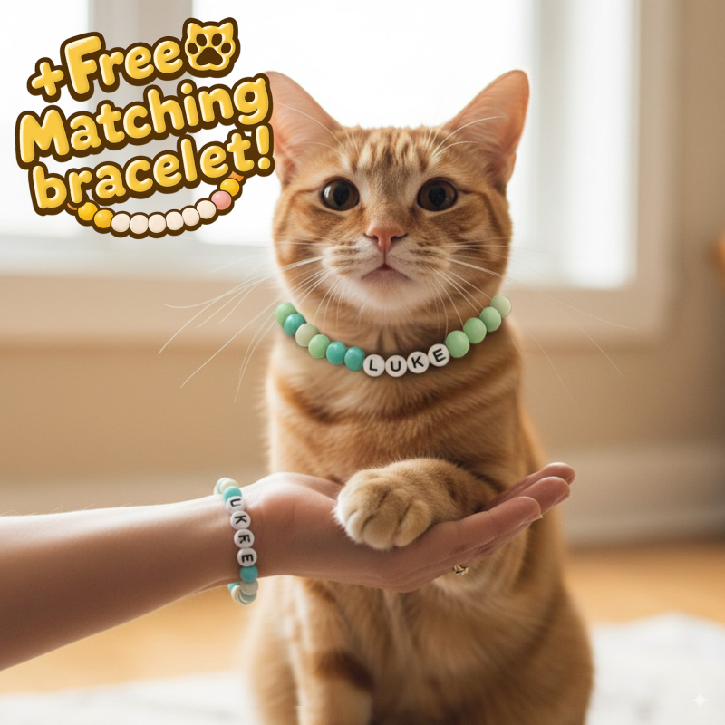 Cada coleira é carinhosamente personalizada com o nome do seu pet usando contas divertidas e coloridas. E agora, você ganha uma pulseira combinando - totalmente GRÁTIS! Use-a para mostrar seu amor e estilo juntos.