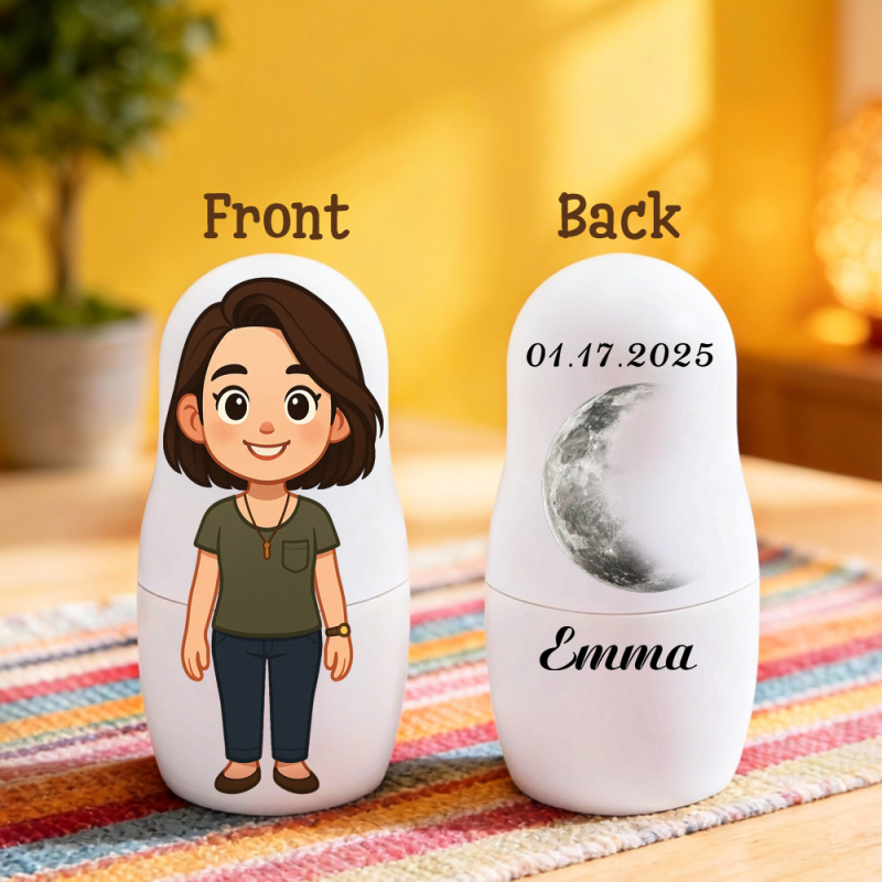 Retrato Personalizado De Boneca Russa Com Fases Da Lua E Texto Em Estilo Cartoon. Presente Ideal Para A Família E Para Casais.