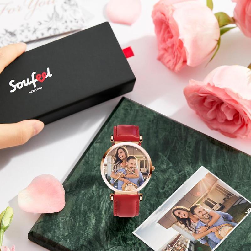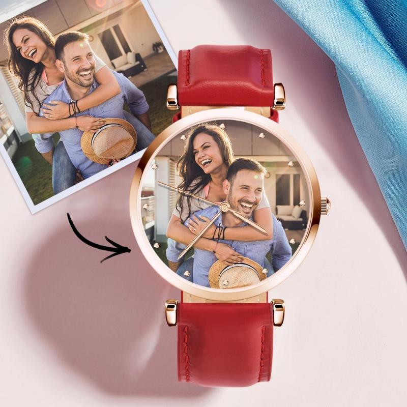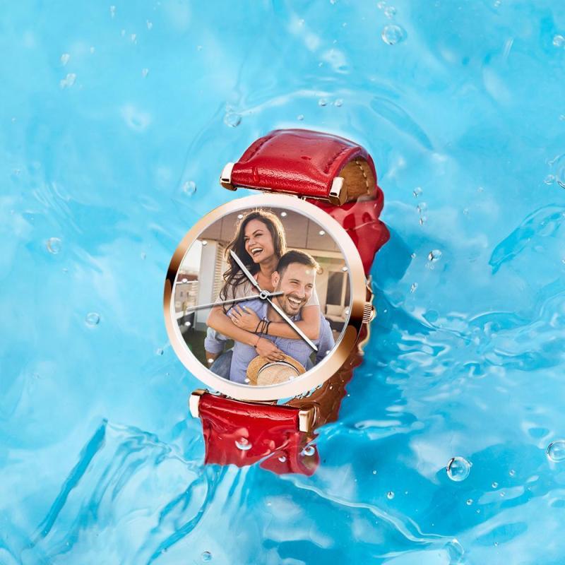 Relógio Gravável com Foto de Pulseira de Couro Vermelho Masculino