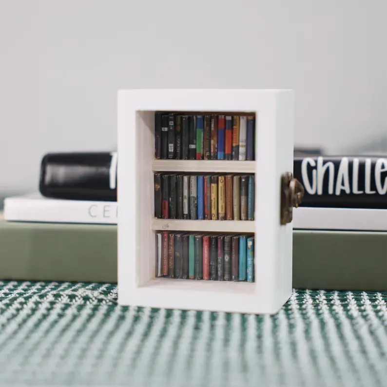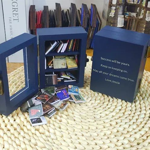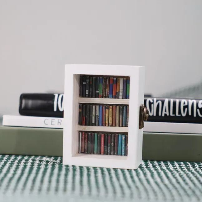 A Estante de Ansiedade é uma estante de madeira em miniatura feita à mão com cerca de duzentos livros em miniatura dobrados.