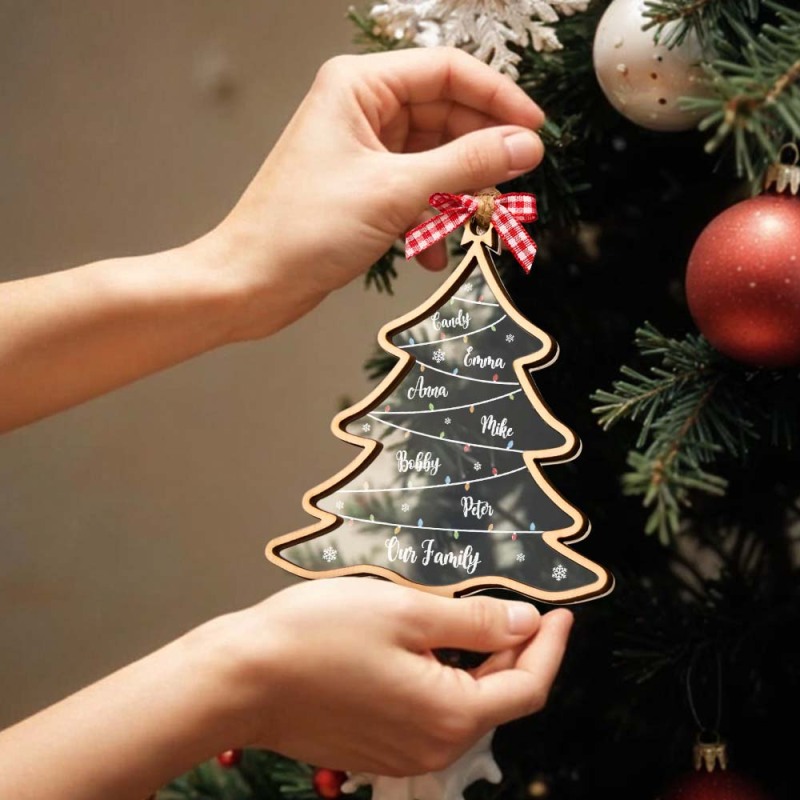 Este enfeite de árvore de Natal personalizado apresenta nomes personalizados, tornando-o um presente atencioso e exclusivo para qualquer família. Comemore a temporada de festas com esta lembrança especial, que certamente será apreciada por muitos anos. Habilmente elaborado e projetado com cuidado, este enfeite é um complemento perfeito para qualquer decoração de Natal.
